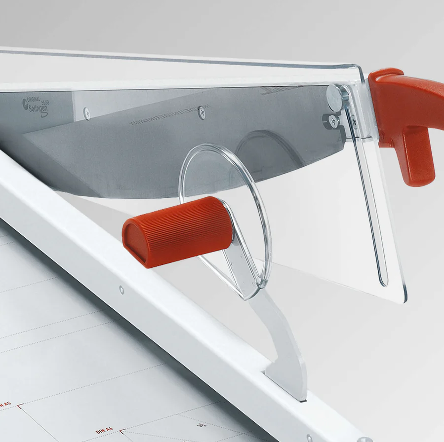 Der transparente, bruchsichere Messerschutz mit Automatik und die manuelle Handhebelpressung sorgen für optimale Sicherheit und einfache Bedienung. Der stabile Messerwinkel aus Aluminiumguss und die zweifach gelagerte Messerachse gewährleisten exakte, winkelgenaue Schnitte. Auf dem Schneidetisch sind DIN-Formate und Winkelmarkierungen übersichtlich aufgedruckt, was rationelles Arbeiten erleichtert.