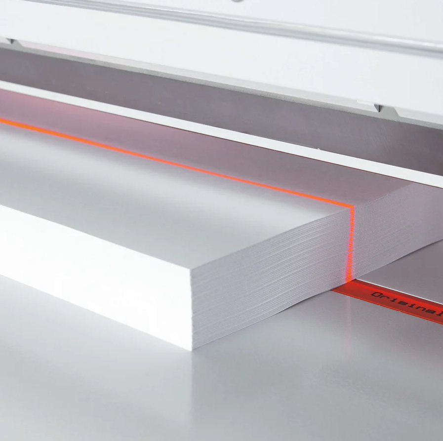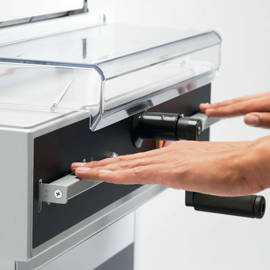 Der IDEAL 4350 ist ein vielseitiger und sicherer Büro-Stapelschneider für den professionellen Einsatz bis DIN A3. Ausgestattet mit der patentierten EASY-CUT Zweihand-Schnittauslösung und automatischer Pressung überzeugt dieses Modell durch hohe Anwendersicherheit und exakte Schnittergebnisse – ideal für administrative Umgebungen, Bildungseinrichtungen oder kleine Druckereien. Dank des SCS – Safety Cutting System erfüllt der IDEAL 4350 höchste Sicherheitsstandards: Eine elektronisch kontrollierte, transparente Sicherheitsvorrichtung auf dem Vordertisch, eine transparente Rücktischabdeckung, ein Hauptschalter, ein Sicherheitsschloss sowie eine 24-Volt-Steuerung schützen zuverlässig bei jedem Arbeitsschritt. Zusätzlich sorgen ein automatischer Rücklauf des Messers und des Pressbalkens sowie eine Scheibenbremse für maximale Bediensicherheit. Die automatische Pressung fixiert das Schnittgut gleichmäßig und zuverlässig. Der elektro-mechanische Messerantrieb ermöglicht einen sauberen Schnitt auch bei Papierstapeln bis zu 40 mm Höhe (entspricht ca. 400 Blatt). Die Einstellung des Rückanschlags erfolgt präzise über eine Handkurbel mit spindelgeführtem Lauf und wird durch die digitale Maßanzeige unterstützt – umschaltbar zwischen cm und inch. Ein optischer LED-Schnittandeuter visualisiert die Schnittlinie für noch mehr Genauigkeit. Für Wartung und Langlebigkeit ist gesorgt: Der Messerwechsel kann einfach von vorne durchgeführt werden, ohne Gehäuseteile zu demontieren – dank Messerwechsel-Vorrichtung mit abgedeckter Klinge. Die Schnittleiste lässt sich seitlich wechseln, werkzeuglos und sicher. Der IDEAL 4350 ist in robuster Ganzmetall-Ausführung gefertigt und steht für zuverlässige Qualität „Made in Germany“. Durch sein durchdachtes Design, hohe Reparaturfreundlichkeit und langlebige Komponenten ist er ein nachhaltiger Begleiter im Büroalltag.