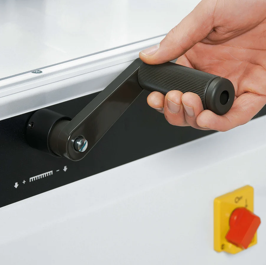 Der IDEAL 4815 ist ein leistungsstarker, elektrischer Stapelschneider für professionelle Schneidaufgaben bis DIN A3+. Mit einer großzügigen Schnittlänge von 475 mm und einer Schnitthöhe von bis zu 80 mm bewältigt er mühelos Papierstapel mit mehreren Hundert Blatt. Die patentierte EASY-CUT Schnittauslösung sorgt dabei für eine komfortable und sichere Zweihandbedienung – eine klare Stärke bei regelmäßigem Einsatz im Büro, in Copyshops oder in kleineren Druckereien. Das SCS – Safety Cutting System schützt Anwender umfassend: Eine elektronisch überwachte, schwenkbare Sicherheitsvorrichtung auf dem Vordertisch verhindert Schnitte bei offenem Schutz. Die Sicherheitsabdeckung am Rücktisch, ein Hauptschalter, die 24-Volt-Steuerung und der automatische Messerrücklauf ergänzen das Sicherheitskonzept. Für zusätzliche Betriebssicherheit sorgen die Scheibenbremse für sofortigen Stopp und der werkzeuglose Messerwechsel über die integrierte Messerwechsel-Vorrichtung mit abgedeckter Messerschneide. Ein weiteres Highlight ist die manuelle Spindelschnellpressung, die sich dank beidseitiger Führung exakt auf jede Papierqualität einstellen lässt. Der Rückanschlag mit Präzisionsspindel wird über eine ergonomische Handkurbel justiert und durch eine gut ablesbare Digital-Maßanzeige unterstützt – umschaltbar auf cm oder inch. Ein optischer Schnittandeuter mit LEDs zeigt die exakte Schnittlinie an und erleichtert so die Ausrichtung. Die massive Ganzmetall-Konstruktion, die ergonomisch optimierte Tischhöhe (940 mm) sowie der serienmäßige Lieferumfang mit stabilem Untergestell, Papierablageboden, Werkzeughalter und Stapelwinkel machen den IDEAL 4815 zu einer besonders nachhaltigen und langlebigen Lösung. Entwickelt und gefertigt in Deutschland – mit dem Anspruch auf höchste Qualität, Funktionalität und Reparaturfähigkeit.
