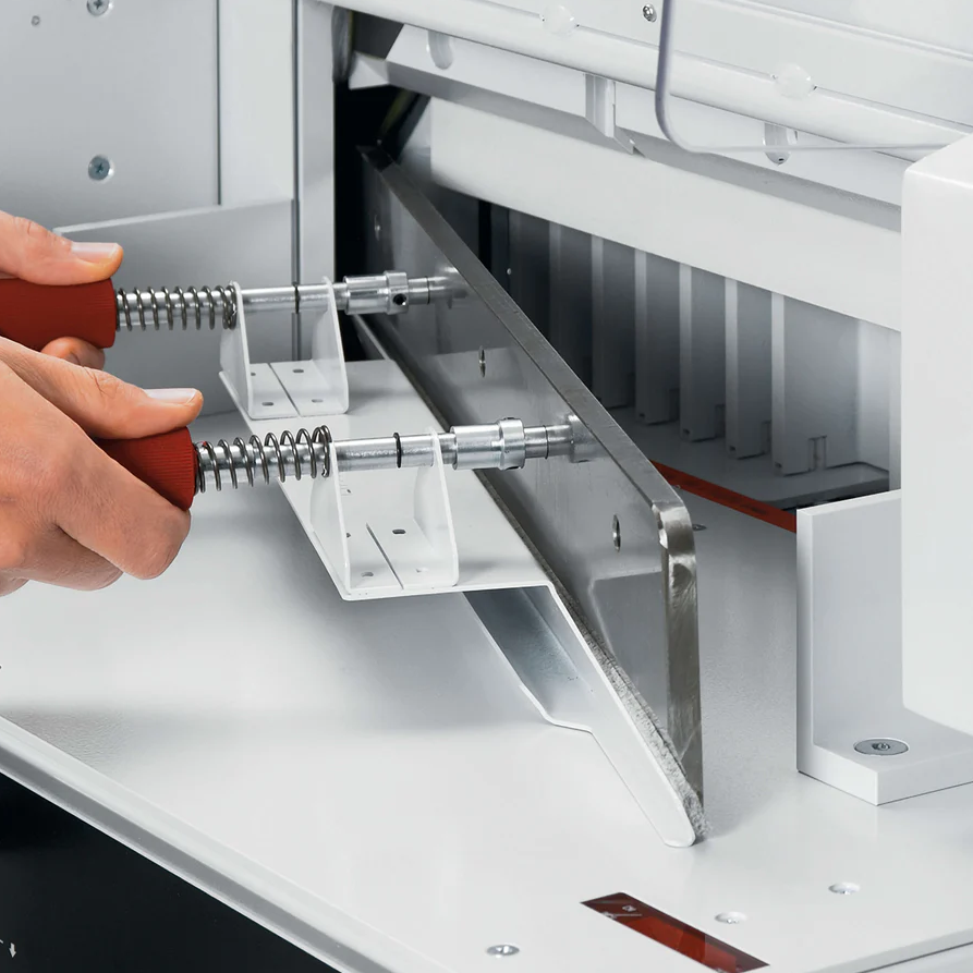 Der IDEAL 4850 ist ein hochwertiger, elektrischer Stapelschneider mit automatischer Pressung für professionelle Einsatzbereiche bis DIN A3+. Mit einer Schnittlänge von 475 mm und einer beeindruckenden Schnitthöhe von bis zu 80 mm verarbeitet er auch große Papierstapel mühelos und präzise. Das Modell vereint Effizienz, Sicherheit und Langlebigkeit – ideal für Druckereien, Agenturen, Copyshops und Unternehmen mit regelmäßigem Schneidebedarf. Die patentierten EASY-CUT Bedienelemente ermöglichen eine ergonomische, sichere Zweihand-Schnittauslösung mit zwei Druckpunkten. Dank der automatischen Pressung wird das Papier zuverlässig fixiert – unabhängig von Material oder Stapelhöhe. Für maximale Sicherheit sorgt das umfassende SCS – Safety Cutting System: Eine elektronisch überwachte, schwenkbare Sicherheitsvorrichtung am Vordertisch, die transparente Rücktischabdeckung, der Hauptschalter, eine 24-Volt-Steuerung und der automatische Rücklauf von Messer und Pressbalken runden das Sicherheitskonzept ab. Der Rückanschlag wird präzise über eine Handkurbel und eine Präzisionsspindel positioniert, unterstützt durch eine digitale Maßanzeige direkt am Vordertisch, die auf cm oder inch umgestellt werden kann. Der optische Schnittandeuter mit leuchtstarken LEDs zeigt exakt die geplante Schnittlinie – für zuverlässige Ergebnisse. Der Messerwechsel erfolgt bequem von vorne über eine spezielle Vorrichtung mit abgedeckter Messerschneide. Die Schnittleiste lässt sich seitlich wechseln, ohne in den Schneidebereich eingreifen zu müssen. Die stabile Ganzmetall-Konstruktion, das serienmäßige Untergestell mit Papierablageboden sowie der praktische Werkzeughalter machen den IDEAL 4850 zu einem besonders langlebigen, wartungsfreundlichen und nachhaltigen Arbeitsmittel – Made in Germany.