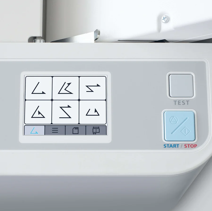 Der intuitive Touchscreen ermöglicht eine einfache Bedienung, schnelle Fehlerbehebung und Zugriff auf die Memory-Funktion für 36 gespeicherte Falzpositionen. Der großzügige Zuführtisch fasst bis zu 500 Blatt, während die Bandauslage mit verstellbarer Papierauswurfrolle die Weiterverarbeitung erleichtert.
