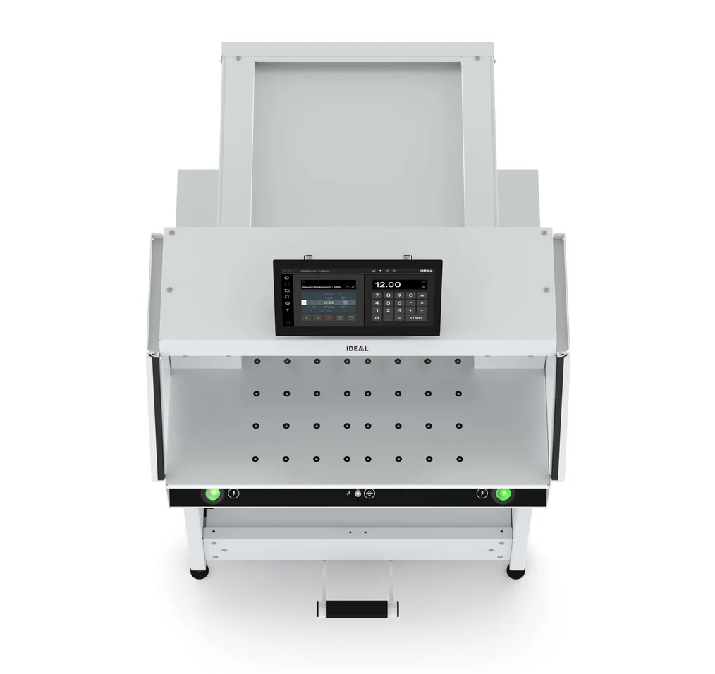 Der IDEAL THE 56 LT ist ein programmierbarer Stapelschneider der neuesten Generation – entwickelt für höchste Ansprüche an Effizienz, Bedienkomfort und Präzision. Mit einer Schnittlänge von 560 mm und einer Schnitthöhe von bis zu 80 mm sowie dem integrierten Lufttisch eignet sich dieses Modell ideal für Druckereien, Buchbindereien und Weiterverarbeiter mit regelmäßigem, hohem Schneidvolumen. Die Bedienung erfolgt über ein großzügiges 15,6" Multi-Touchdisplay, das alle Funktionen übersichtlich darstellt und per Wisch- und Touchgesten steuerbar ist. Die integrierte CUT-CONTROL-Software ermöglicht die schnelle Erstellung und Verwaltung von Schnittprogrammen – inklusive Favoritenfunktion, Suchmodus, und programmierbarem Pressdruck. Mit dem DATA-MANAGER lassen sich Programme benutzer-, kunden- oder projektbezogen strukturieren und auf einem mitgelieferten USB-Stick speichern. Das Herzstück bildet der PRECISION-DRIVE: ein elektromechanischer Messerantrieb in Kombination mit hydraulischer Pressung. Die Presskraft lässt sich stufenlos und programmierbar anpassen. Die Feineinstellung des Rückanschlags erfolgt bequem über ein ergonomisches Bedienelement an der Maschinenfront. Für manuelle Eingriffe steht zusätzlich eine patentierte Fußpressung zur Verfügung – unabhängig vom Maschinenantrieb. Das umfassende SCS – Safety Cutting System schützt den Anwender durch eine elektronisch überwachte IR-Lichtschranke auf dem Vordertisch, einen geschlossenen Rücktisch sowie eine sichere Zweihand-Schnittauslösung (EASY-TOUCH). Der Messerwechsel ist einfach, sicher und werkzeuggestützt – mit abgedeckter Messerschneide und animierter Assistenz. Durch die massive Ganzmetall-Konstruktion, eine ergonomisch einstellbare Arbeitshöhe (950–1000 mm) und langlebige Komponenten ist der THE 56 besonders robust und nachhaltig – mit langfristiger Ersatzteilversorgung und hervorragender Reparierbarkeit. Ein zukunftssicheres Schneidesystem für den professionellen Einsatz „Made in Germany“.