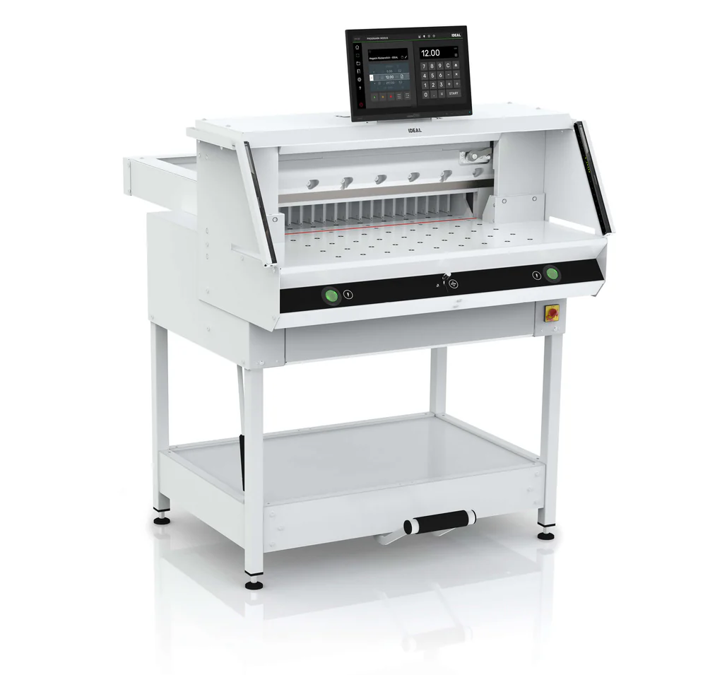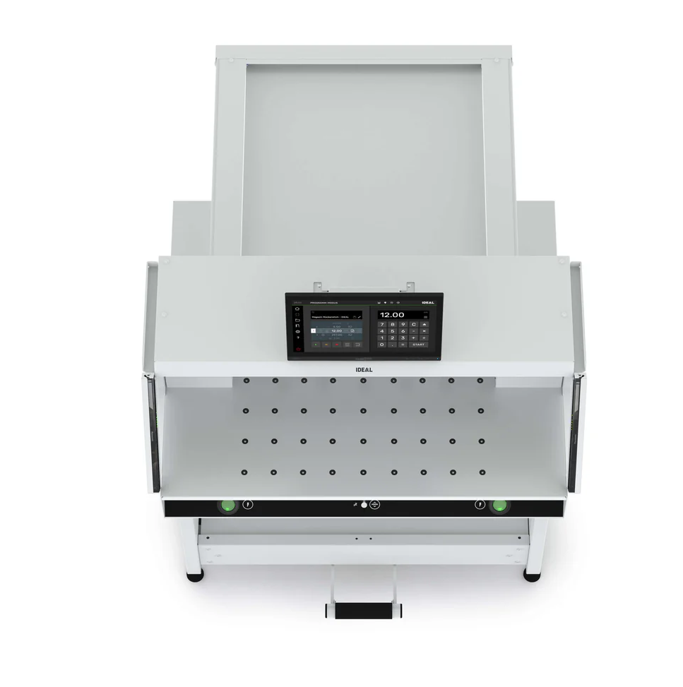 Der IDEAL THE 68 LT ist ein programmierbarer Stapelschneider der neuesten Generation – entwickelt für höchste Ansprüche an Effizienz, Bedienkomfort und Präzision. Mit einer Schnittlänge von 680 mm und einer Schnitthöhe von bis zu 80 mm sowie dem integrierten Lufttisch eignet sich dieses Modell ideal für Druckereien, Buchbindereien und Weiterverarbeiter mit regelmäßigem, hohem Schneidvolumen. Die Bedienung erfolgt über ein großzügiges 15,6" Multi-Touchdisplay, das alle Funktionen übersichtlich darstellt und per Wisch- und Touchgesten steuerbar ist. Die integrierte CUT-CONTROL-Software ermöglicht die schnelle Erstellung und Verwaltung von Schnittprogrammen – inklusive Favoritenfunktion, Suchmodus, und programmierbarem Pressdruck. Mit dem DATA-MANAGER lassen sich Programme benutzer-, kunden- oder projektbezogen strukturieren und auf einem mitgelieferten USB-Stick speichern. Das Herzstück bildet der PRECISION-DRIVE: ein elektromechanischer Messerantrieb in Kombination mit hydraulischer Pressung. Die Presskraft lässt sich stufenlos und programmierbar anpassen. Die Feineinstellung des Rückanschlags erfolgt bequem über ein ergonomisches Bedienelement an der Maschinenfront. Für manuelle Eingriffe steht zusätzlich eine patentierte Fußpressung zur Verfügung – unabhängig vom Maschinenantrieb. Das umfassende SCS – Safety Cutting System schützt den Anwender durch eine elektronisch überwachte IR-Lichtschranke auf dem Vordertisch, einen geschlossenen Rücktisch sowie eine sichere Zweihand-Schnittauslösung (EASY-TOUCH). Der Messerwechsel ist einfach, sicher und werkzeuggestützt – mit abgedeckter Messerschneide und animierter Assistenz. Durch die massive Ganzmetall-Konstruktion, eine ergonomisch einstellbare Arbeitshöhe (950–1000 mm) und langlebige Komponenten ist der THE 68 besonders robust und nachhaltig – mit langfristiger Ersatzteilversorgung und hervorragender Reparierbarkeit. Ein zukunftssicheres Schneidesystem für den professionellen Einsatz „Made in Germany“.